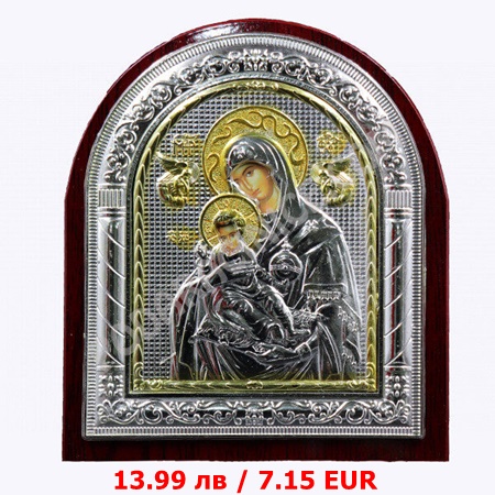 Тази чудесна настолна икона с изображението на Св. Богородица и младенеца е изработена от пластмаса върху основа от дърво (МДФ). Пластмасата е оцветена така че да изглежда като метален обков и така иконата придобива стил.
